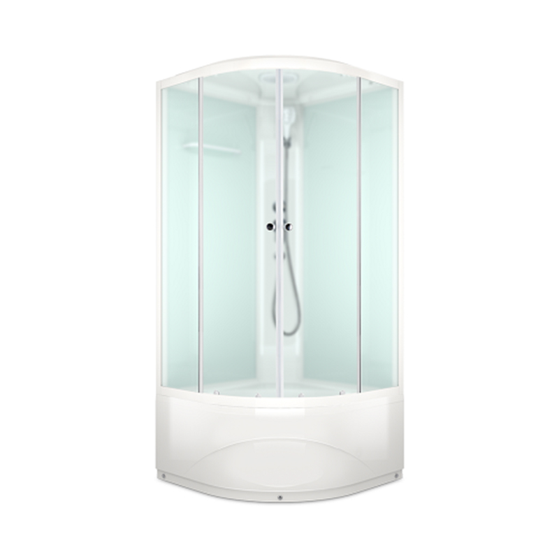Угловая душевая кабина со стекляными матовыми стеклами, белыми стенками и профилем. Высокий поддон. Открытие и закрытие двери одной рукой. В комплекте смеситель, верхний душ и ручной душ на гибком шланге. Полочка для ванных принадлежностей. душевая кабина укомплектована сливными кнопками с системой забора волос и другого мусора, что позволяет сократить денежные расходы, связанные с чисткой или заменой канализации. Поддон усилен сплошной плитой ДСП 16 мм. Поддон, стенки и крыша изготовлены из прочного санитарного акрила. Завод находится в России и разработал уникальную конструкцию профиля, благодаря которой, горизонтальный профиль ложится не рядом с бортиком, а на бортик, и не имеет движения по поддону, что обеспечивает жесткость конструкции, а отсутствие зазора между профилем и бортом препятствует скоплению трудноизвлекаемой грязи. Формы деталей для душевых кабин изготавливаются на станках ЧПУ, что дает деталям стыковаться друг с другом без малейших зазоров. В производстве используются экологичные материалы.