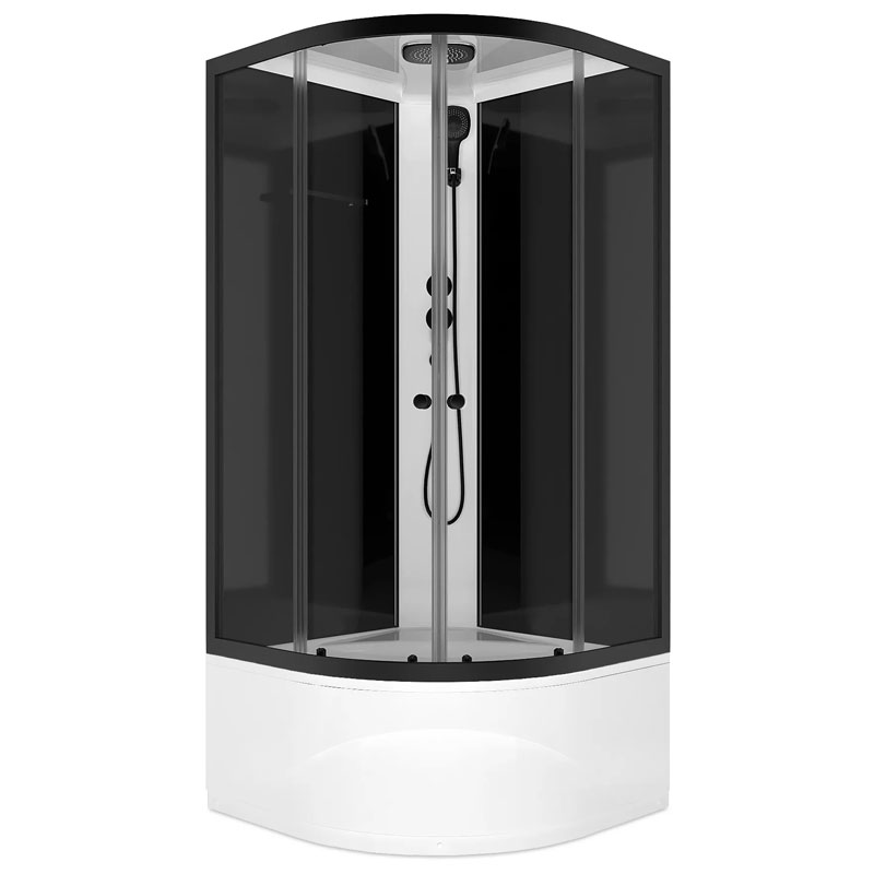 Угловая душевая кабина с прозрачными стеклами, черными стенками и черным профилем. Высокий поддон. Открытие и закрытие двери одной рукой. В комплекте смеситель, верхний душ и ручной душ на гибком шланге в черном цвете. Полочка для ванных принадлежностей. Душевая кабина укомплектована сливными кнопками с системой забора волос и другого мусора, что позволяет сократить денежные расходы, связанные с чисткой или заменой канализации. Поддон усилен сплошной плитой ДСП 16 мм. Поддон, стенки и крыша изготовлены из прочного санитарного акрила. Завод находится в России и разработал уникальную конструкцию профиля, благодаря которой, горизонтальный профиль ложится не рядом с бортиком, а на бортик, и не имеет движения по поддону, что обеспечивает жесткость конструкции, а отсутствие зазора между профилем и бортом препятствует скоплению трудноизвлекаемой грязи. Формы деталей для душевых кабин изготавливаются на станках ЧПУ, что дает деталям стыковаться друг с другом без малейших зазоров.