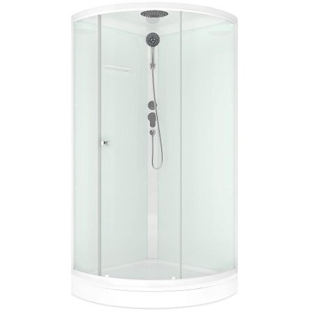 Угловая душевая кабина со стекляными прозрачными дверцами и белыми стенками и профилем. Низкий поддон. Открытие и закрытие двери одной рукой. В комплекте смеситель, верхний душ и ручной душ на гибком шланге. Полочка для ванных принадлежностей. Душевая кабина укомплектована сливными кнопками с системой забора волос и другого мусора, что позволяет сократить денежные расходы, связанные с чисткой или заменой канализации. Поддон усилен сплошной плитой ДСП 16 мм. Поддон, стенки и крыша изготовлены из прочного санитарного акрила. Завод находится в России и разработал уникальную конструкцию профиля, благодаря которой, горизонтальный профиль ложится не рядом с бортиком, а на бортик, и не имеет движения по поддону, что обеспечивает жесткость конструкции, а отсутствие зазора между профилем и бортом препятствует скоплению трудноизвлекаемой грязи. Формы деталей для душевых кабин изготавливаются на станках ЧПУ, что дает деталям стыковаться друг с другом без малейших зазоров.