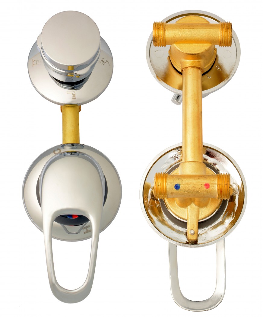 Поставляется в заводской сборке с металлическими хромированными ручками и монтажными креплениями (прижимными гайками). Подключение горячей и холодной воды выполнено под гайку 1/2 дюйма, подключение узла переключения режимов — под хомут (штуцер под шланг c внутренним сечением 10 мм), расстояние между центрами ручек — 100 мм. Корпус смесителя изготовлен из латуни, соединительная труба — впаянная латунная.
