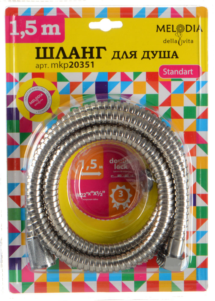 Шланг для душа MELODIA STANDARD M22*1/2" конус PVC с оплеткой из нержавеющей стали, диаметр 14 мм, длина 150 см, двойной зажим, упакован в блистер. Шланг для душа MELODIA используется совместно с душевыми или гигиеническими смесителями, а также душевыми лейками. Присоединение к смесителю с помощью накидной гайки M22 (латунь), присоединение к лейке с помощью конусной накидной гайки 1/2" (латунь). Шланг подходит к отечественным смесителям и импортным лейкам.