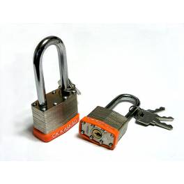 Навесной замок с длинной дужкой и автоматическим запиранием. Размер 50 мм, диаметр дужки 9 мм, корпус замка наборный из металлических пластин из высокопрочной стали с оцинковкой. В комплекте 3 английских ключа, ширина/высота - 55/108 мм.